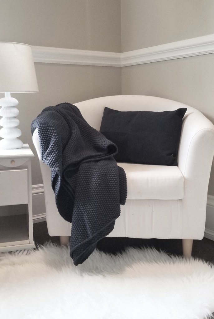 Some modern-style homes have a pop of colour: such as the navy blue and white reading nook tub chair above.