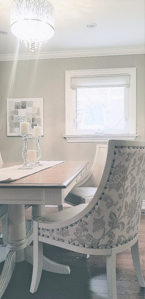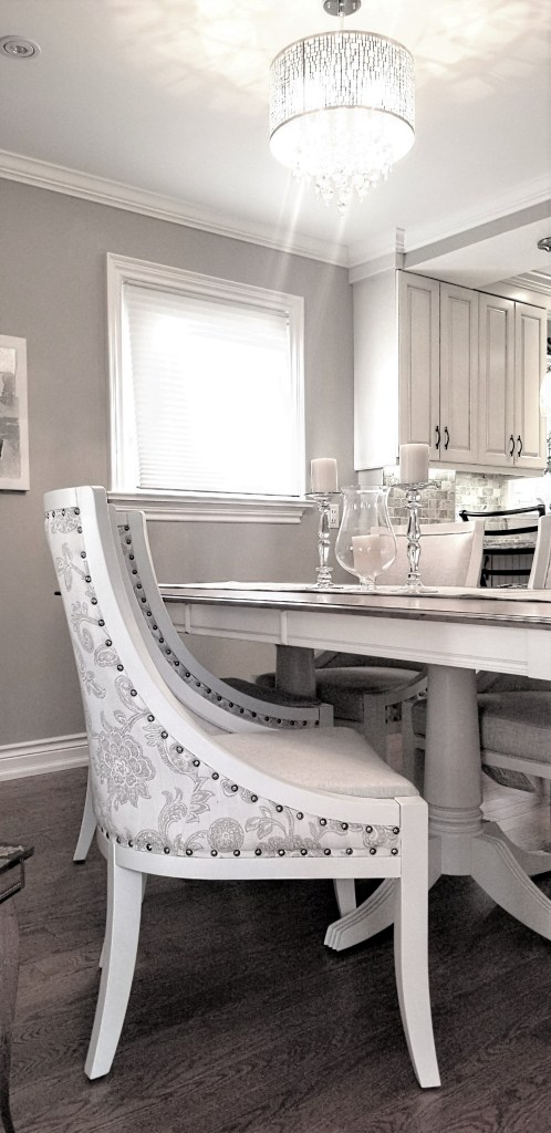Modern farmhouse often mixes two-tone furniture pieces, such as mixing wood stain with paint. The Newmarket, Ontario couple who owned this home chose furniture partially painted a warm white. Their pedestal table body and the chairs are in a warm white. The painted wood and stained furniture give the dining room an iconic modern farmhouse feel.