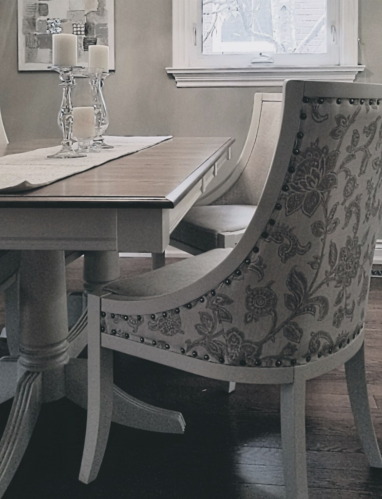 The modern farmhouse table works well with the formal-style dining chairs in this dining room pictured above. The chairs have the silhouette of a Victorian-style tub chair. The only ornament on it is the nail head trim. Nailhead trim was invented in the 1600s and used by English and French upholsterers in the 17th, 18th, and 19th centuries.