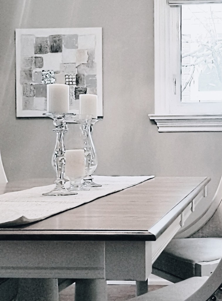 Modern farmhouse dining room centrepieces include using candles which add a warm feeling to the room. Glass also brings a sheen and a sense of glamour. The glass hurricane lamp and turned vase-shaped candle sticks echo the turning on the pedestal in this kitchen and dining room combo. Glam glass candlesticks give the space more sparkle and dress up the farmhouse table. You also can add shiny accessories such as glass candlesticks to your room to up the glam.