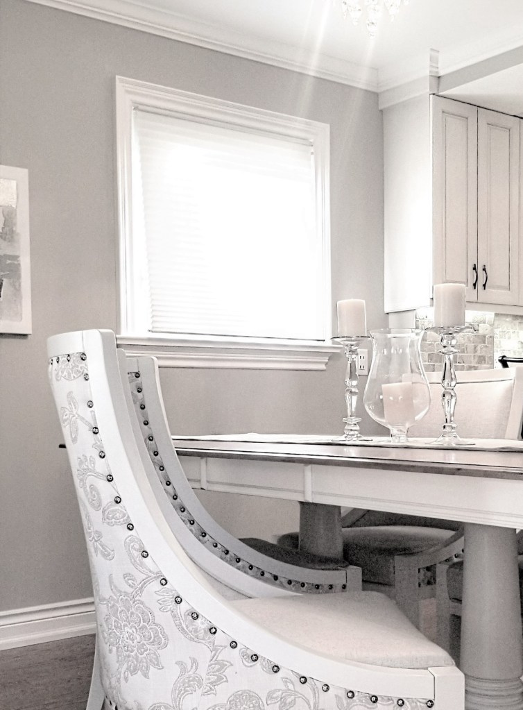 This dining room feels very luxurious and glamorous because of the shiny nail head trim on the chairs, the sparkling glass candlesticks, the glossy wall art, and the sleek drum shade which makes up the shimmering crystal chandelier. These all add a glam vibe to the room.