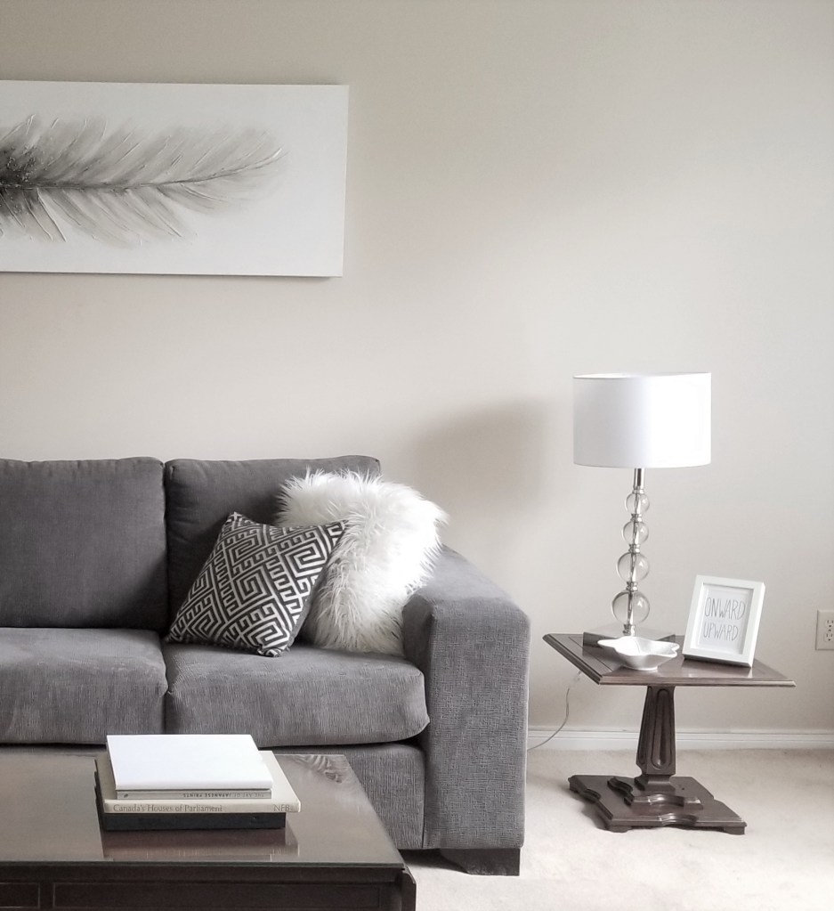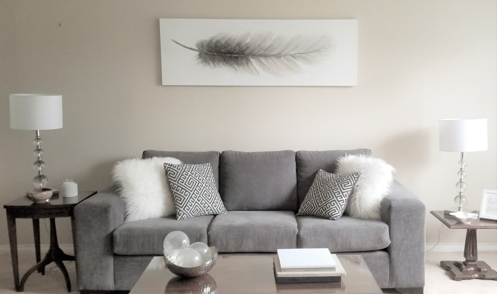 This living room has a neutral colour palette. There are grays on the sofa, throw pillows and wall art. And there is white on the lamp shades, wall art, candle, plate, accent pillows, coffee table book, orbs and picture frame. The gray and whites add a modern touch to the room.