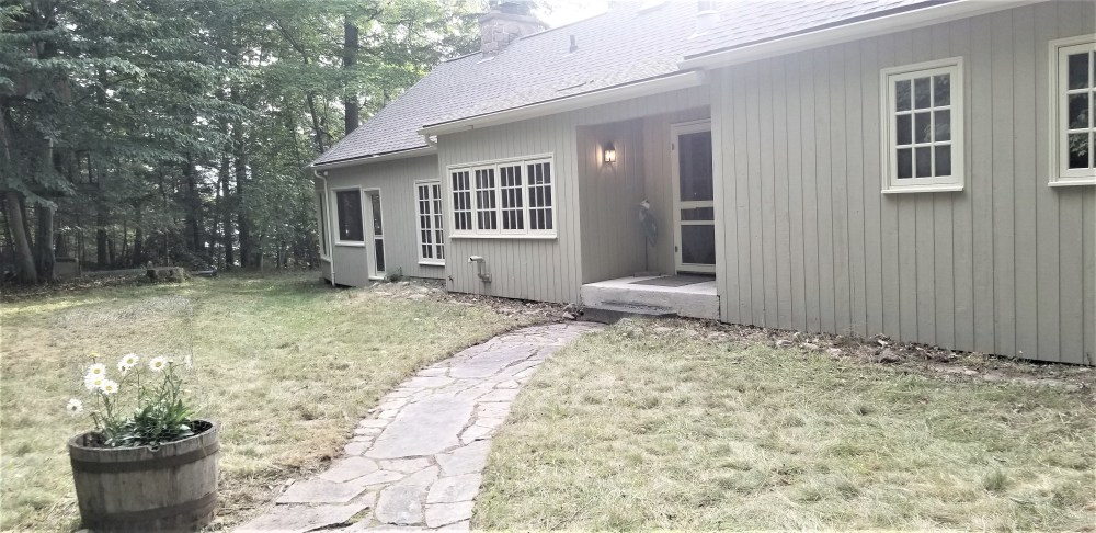 Roofing is a critical feature of the exterior of your home or cottage. So picking the shingle’s colour is crucial. In the summer of 2021, we replaced the old shingles with dark gray ones called weathered wood. It works well with the colours of the tree trunk bark that you can see in the forest to the side of the cottage. The photo above shows you what I mean. And as you can see, these shingles coordinate with the gray flagstone path at the front of the lake house.