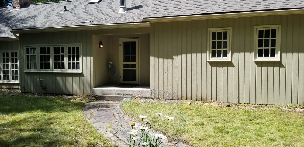 The south-facing side of our cottage looks gray and white. Direct south-facing light washes out or drains the green undertone. It is something to consider if you want the undertone to be visible on specific sides of your house, like the front or back.