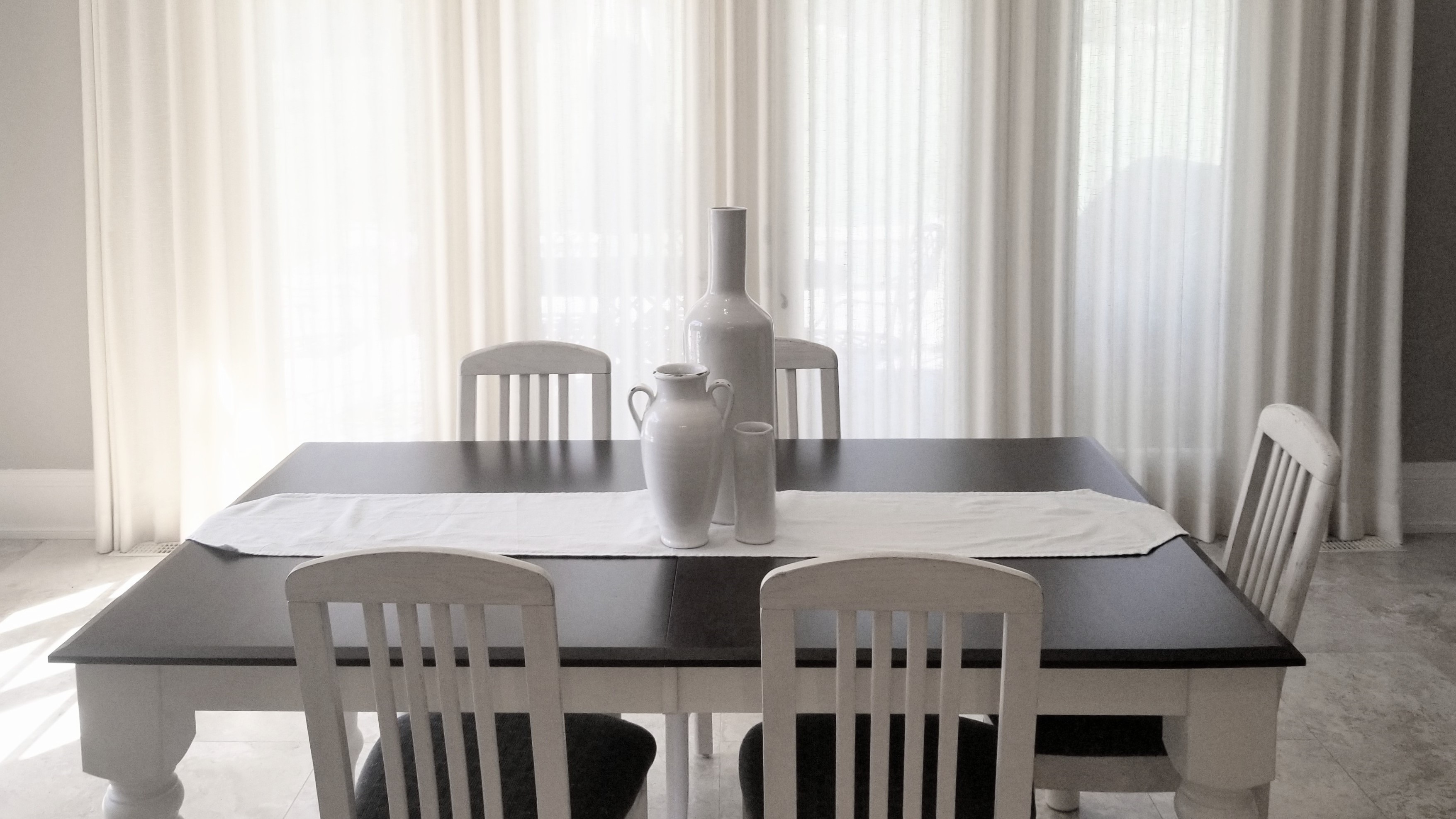 The adjacent breakfast room was redecorated with linen sheers and a modern farmhouse table, since one of us loves country and traditional and the other one us us prefers a modern aesthetic. Modern accents were placed on the table and shelves. Most of the tabletop and shelf accessories are from our travels. These accessories adds that sentimental personal touch.