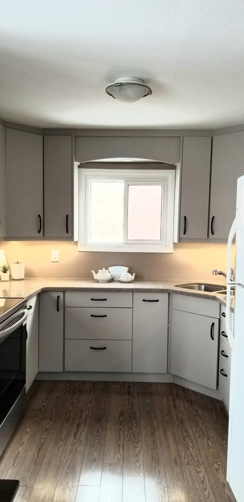 When the neutral-cool 4000K under-cabinet strip lighting is turned on only—often considered a balance between warm and cool light—it shifts the cabinet colour toward a more taupe-gray rather than beige. Similarly, when natural light is cooler, such as on an overcast, grey January afternoon (like in the photo), the cabinets can read noticeably more gray. In this case, it’s the combination of cooler natural light and cooler artificial lighting that creates that taupe-gray appearance in the kitchen.
