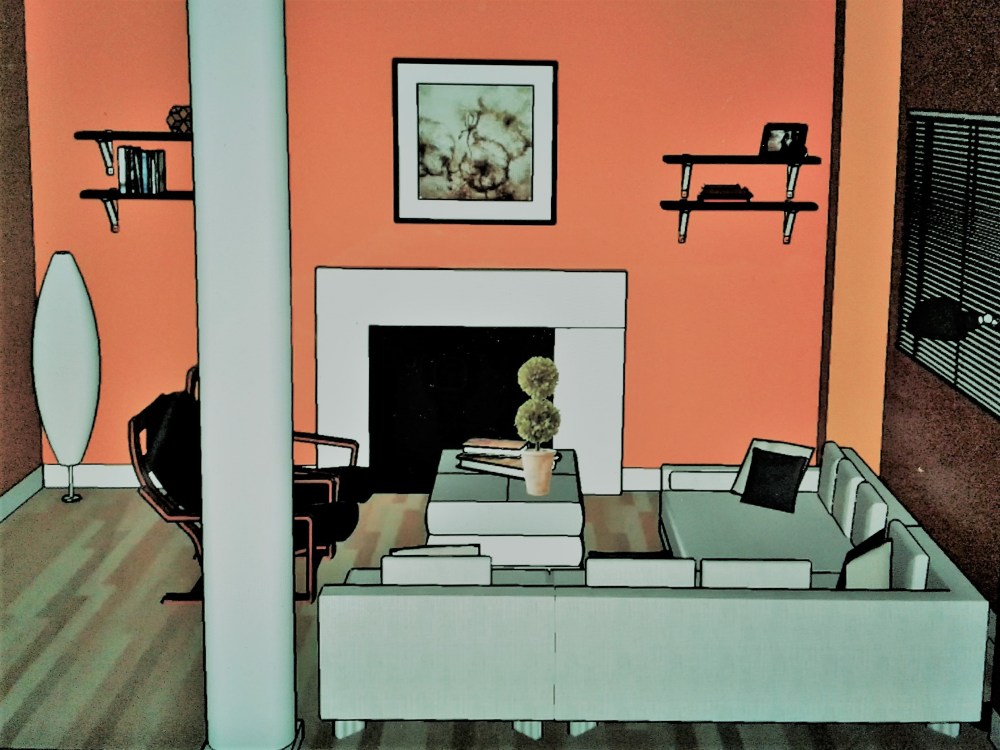 Perspective drawing by Lynteriors, for a client that wanted a sectional to fit into the space between the column and wall