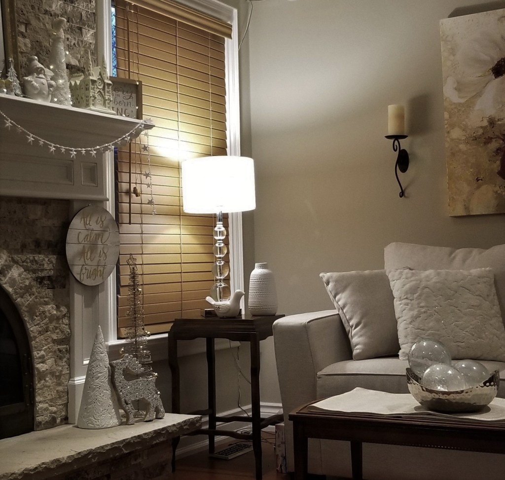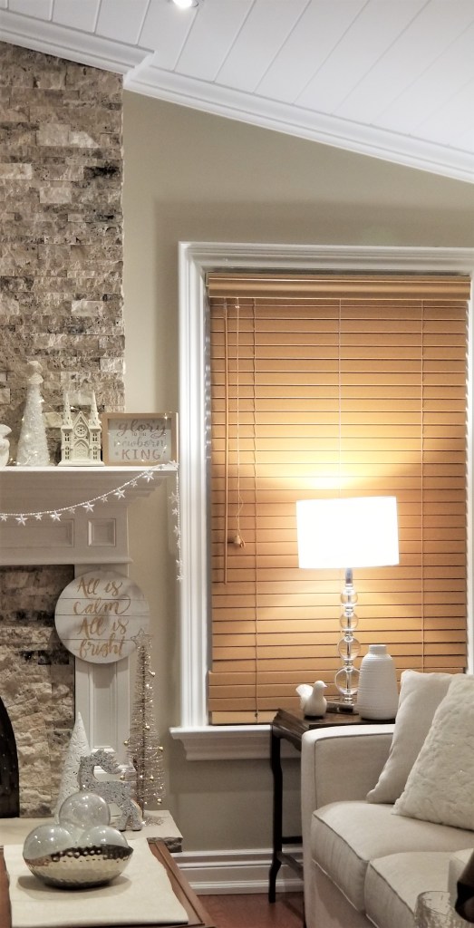 The family room is often the room your family will gather to celebrate Christmas, and in this room, you will welcome your guests. As a result, decorating this room is important. The homeowner chose the angel accent piece to decorate the end table and a white house accessory piece to decorate the coffee table. I took pictures of this look too.