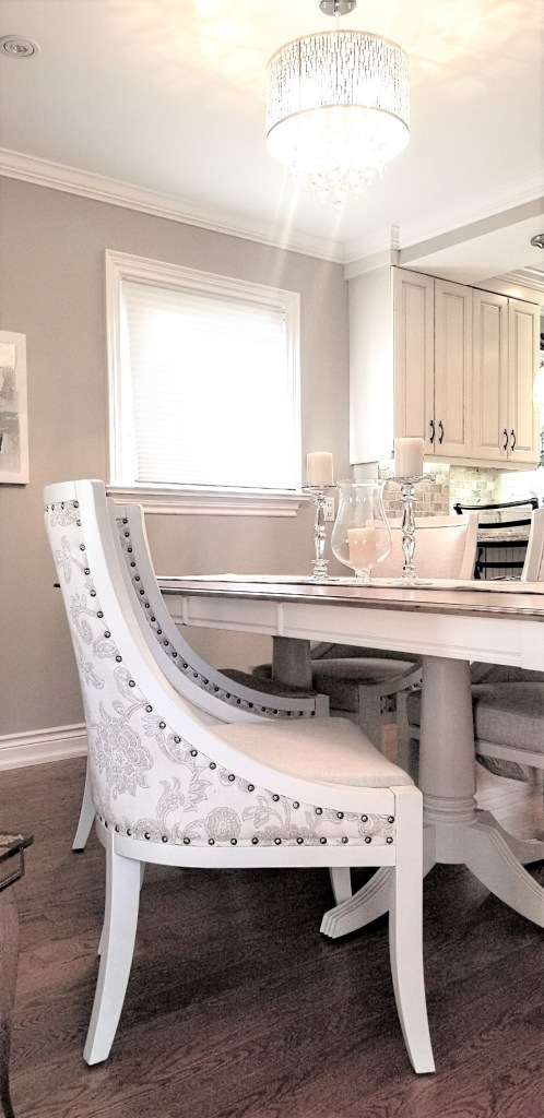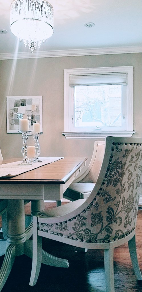 Vogue identifies a similar trend. According to them, “Instead of purchasing all new furnishings, people are increasingly sprinkling in antiques, and vintage pieces among more modern designs says Milwaukee-based interior designer Anna Franklin. Forbes says the same thing. They state there will be ” A blend of old and new: contemporary artwork and lighting paired with classic furniture silhouettes.” The trends are seen in my customer’s home too. For example, the dining room table in my Newmarket client’s home has a classic turned pedestal leg. It is paired with a contemporary abstract wall art and contemporary ceiling fixture, which the photo below reveals.