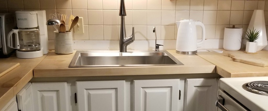 This year, we decided to start part two of our renovation, which involved replacing our countertops. Initially, we considered replacing our worn and damaged kitchen counter with a white quartz countertop. However, my husband, Steve, suggested opting for wood countertops instead. Since it’s a cottage, wood would be an excellent material to enhance that cottage feel, so I agreed with his idea.