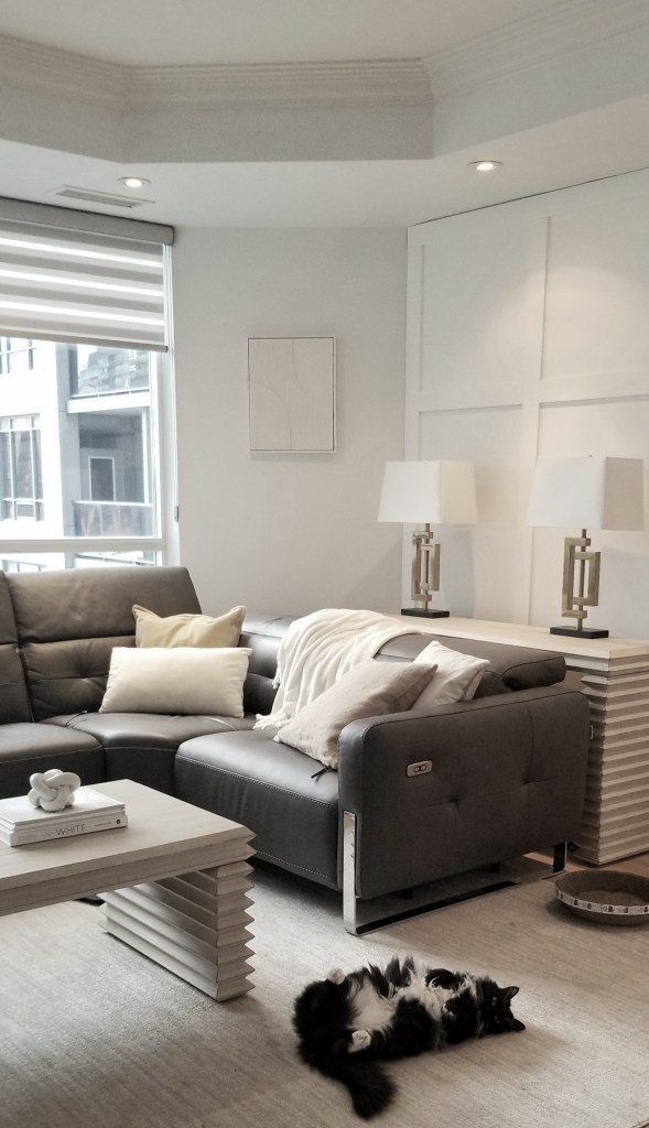 You may be wondering, what is minimalist interior design? Well, clean lines, uncluttered simplicity, and “less is more” embody this style and it is a lasting interior design aesthetic rather than a trend. Secondly, a minimalist living room promotes a calming atmosphere. This style emphasizes simplicity while creating a warm and welcoming environment without excess. And, it focuses on functional furniture and essential elements, making every piece purposeful. Furthermore, one of its key attributes is a neutral colour scheme enhanced by thoughtful textures and patterns. All of the characteristics of minimalism create a soothing and inviting space that has a timeless aesthetic. For instance, my clients in Toronto chose sophisticated neutrals like white, ivory, and black, proving that minimalism can be elegant and inviting.