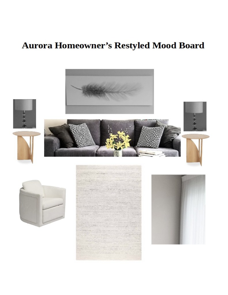 When I start designing for you, I carefully select furniture and accessory pieces that align with your room’s layout, your preferred style, and your preferred colour scheme. I included images of these pieces on the board to showcase how they contribute to the overall design. You can see what I mean as I share more about my most recent interior design project below.