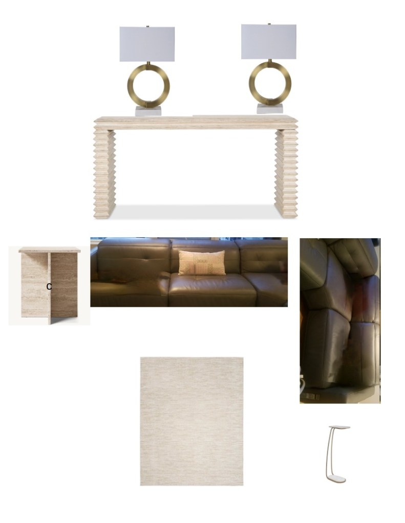 The Toronto condo owners wanted white and gold furnishings with a minimalist modern feel. The wife had a fondness for marble. So, I made sure I incorporated it in the design. The board I created showcases images of the table lamps. I also showcase a C table with brass and marble which has a modern feel. The board also shows how the existing sectionals and the new furniture will look together in the actual space. And, the board highlights furnishings that bring their colour scheme and furniture style preferences to life.
