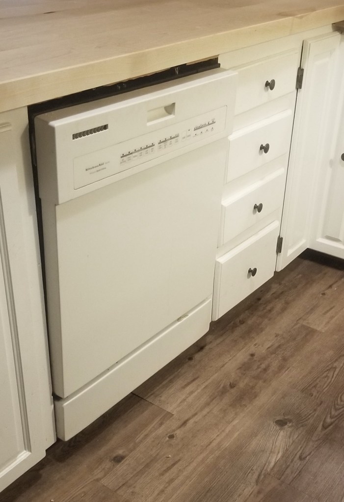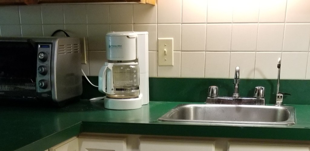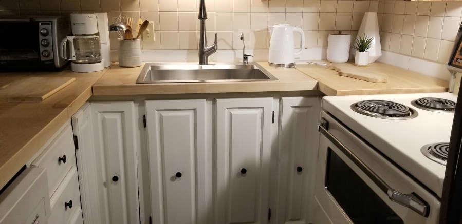 This year, we are replacing our sink, faucet, and green countertops to update it.Check out the photos of our DIY kitchen transformation at Lake of Bays! It’s amazing to see how far we’ve come with this project! If you look closely, you can spot the damaged backsplash behind the faucet, which hides the large hole. We’re making great strides in our renovation project! While a few areas in the kitchen await our touch, the overall progress is exciting to see.