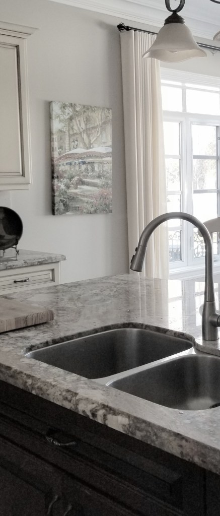 The kitchen island pictured below has a dark chocolate stain finish. But the breakfast room had no dark chocolate decor or architecture. As a result, the colour schemes in the open-plan kitchen and breakfast room looked imbalanced. It was too light in the breakfast room and dark in the kitchen area.